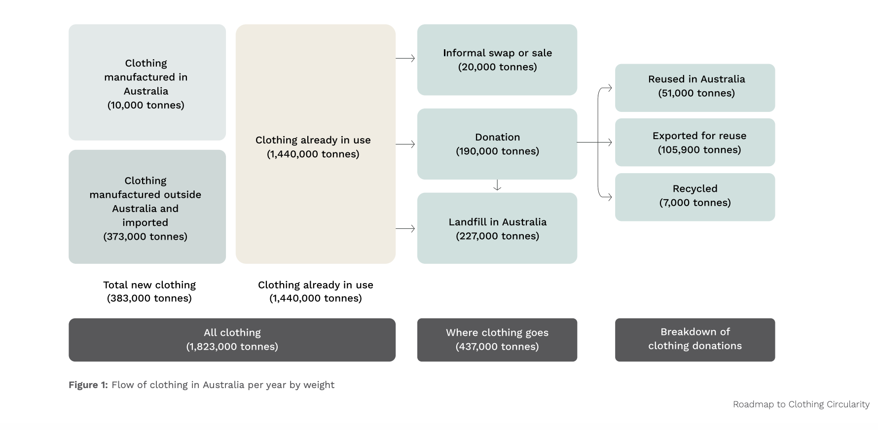 The roadmap outlines that 10,000 tonnes of clothing are produced in Australia annually, with an additional 373,000 tonnes imported. This means that 383,000 tonnes of new clothing items are added each year. Additionally, there are around 1.4 billion tonnes of clothing already in use, including those in the back of cupboards or in thrift shops.
